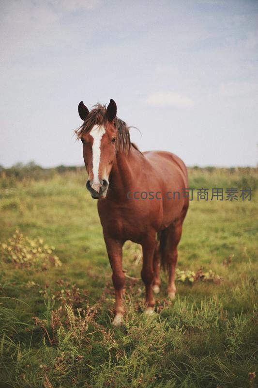 一匹健壮的棕色骏马伫立在绿意盎然的草原上,额头白色条纹清晰可见,眼神温和而专注,背景是开阔天空与稀疏植被。