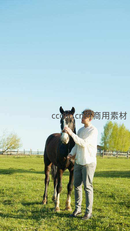 年轻男子身着白衣,在明媚阳光下的翠绿牧场中温柔抚摸一匹黑色骏马,营造出恬静安逸的田园诗意。