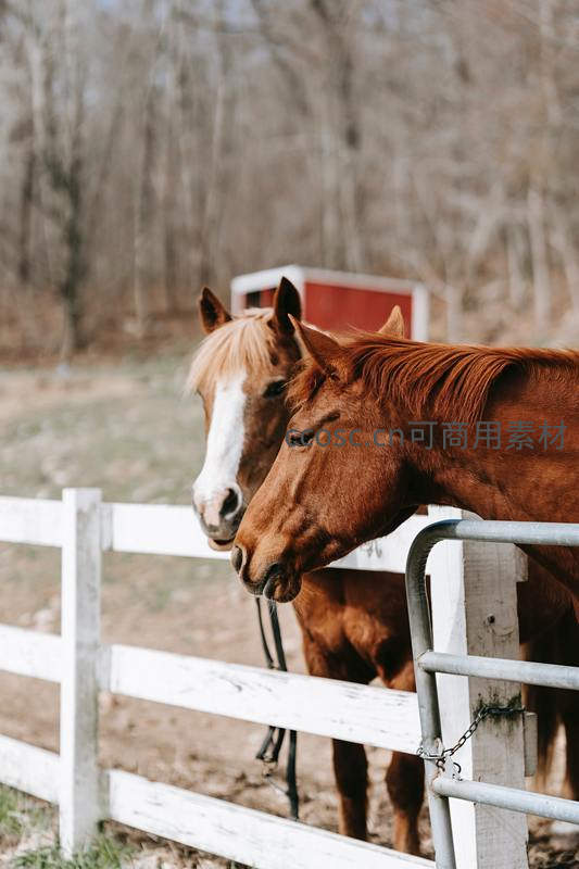 双马并肩倚靠栅栏共享午后时光