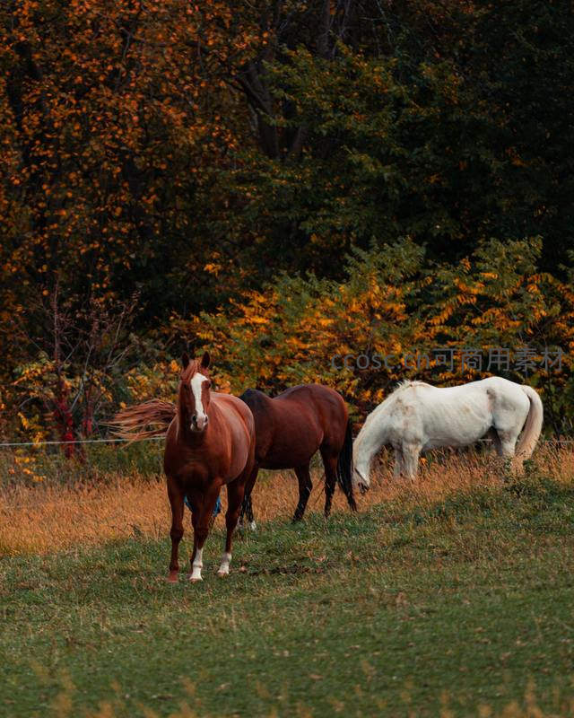 秋日牧场三马悠然吃草