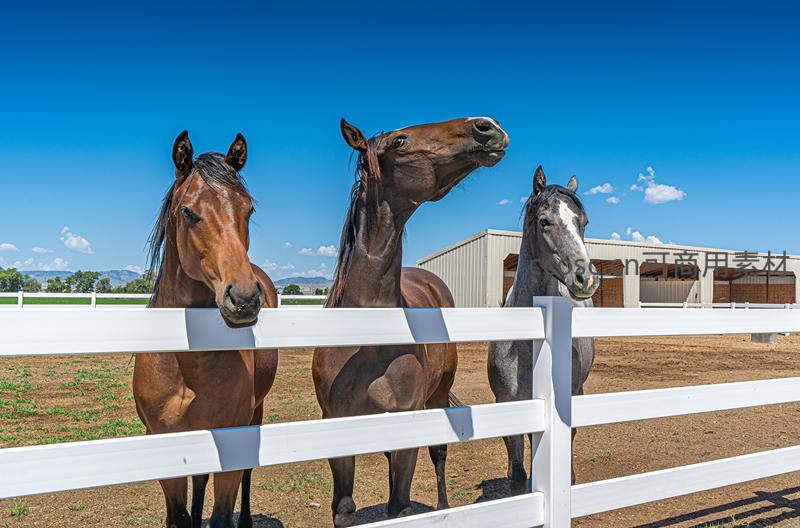 三匹骏马从白色围栏后探出头来,表情各异,充满好奇与灵动,背景是晴朗蓝天和农舍,画面明亮活泼惹人喜爱。