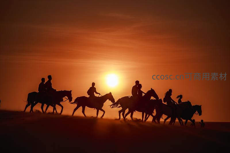 沙漠落日时骑马队伍剪影