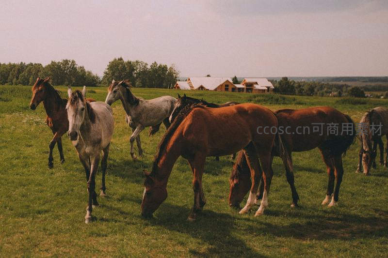 阳光洒在翠绿草地上,多匹骏马或低头吃草或相互追逐,背景木屋与树林点缀,营造出温馨宁静的乡村牧场景致。