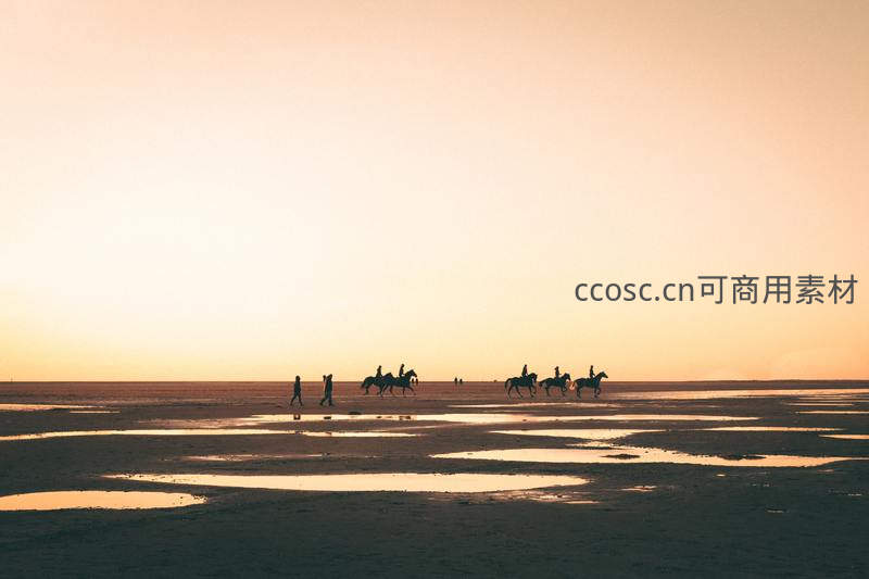 日落滩涂上骑马队伍剪影悠行