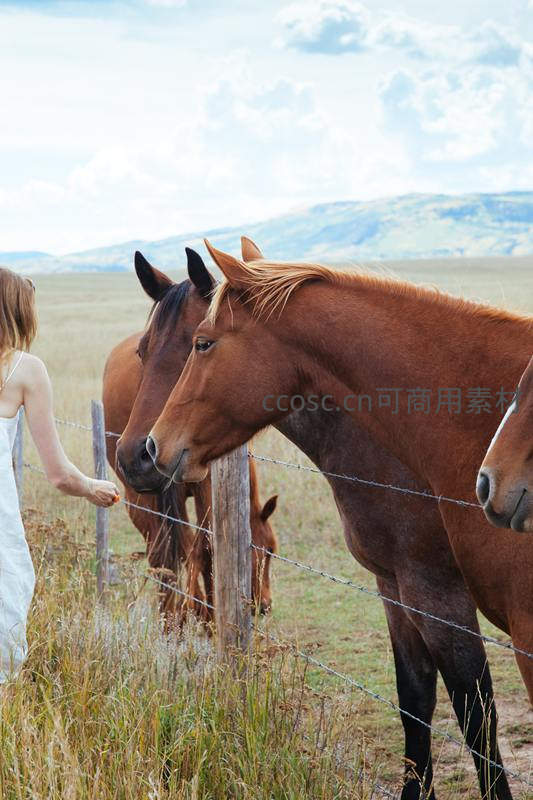 女子牧场喂马,人与自然和谐瞬间