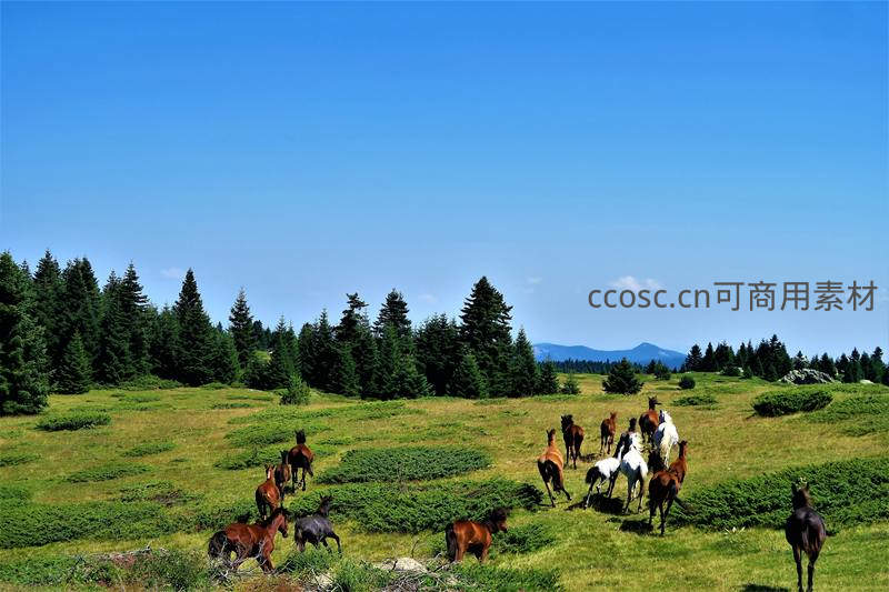 一群骏马在广袤无垠的绿色草地上自由奔跑,远处是茂密的松树林和湛蓝的天空,展现出大自然的壮丽与生命的蓬勃力量。