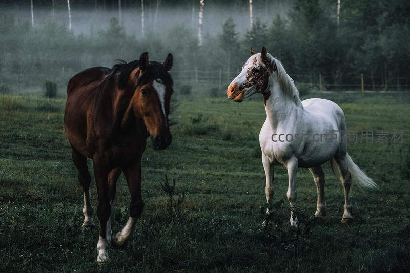 雾中双马对望,棕白相映成趣
