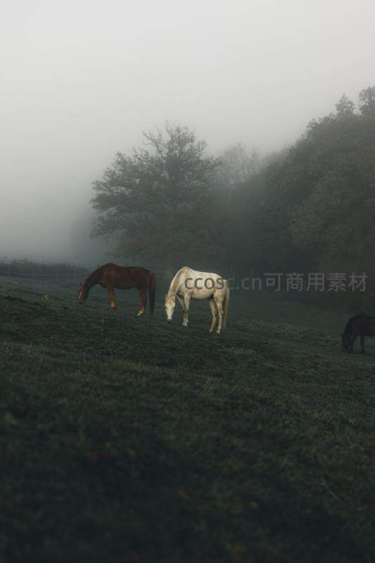雾中草地上吃草的马