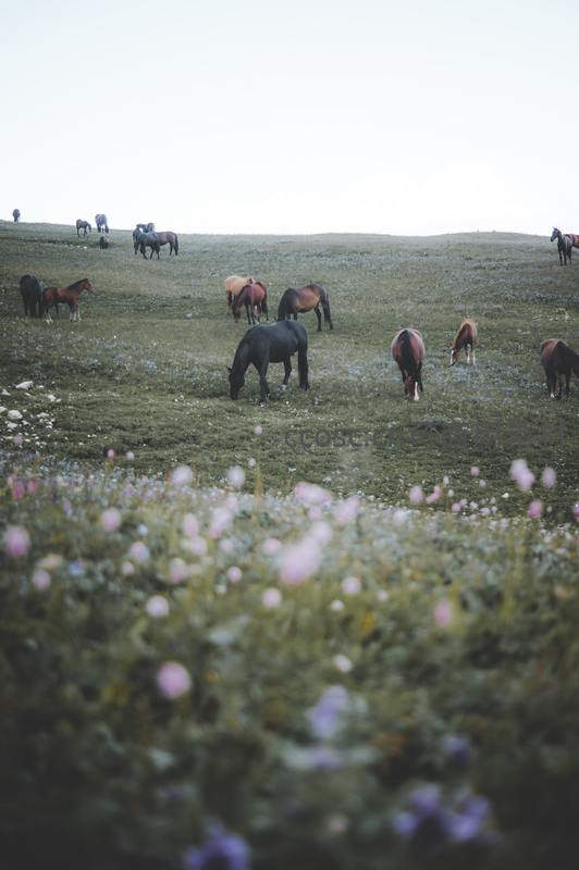 绿意盎然的草原上点缀着粉紫色野花,多匹马儿低头吃草,远处山坡上还有几匹悠闲踱步,整个画面充满生机与田园诗意。
