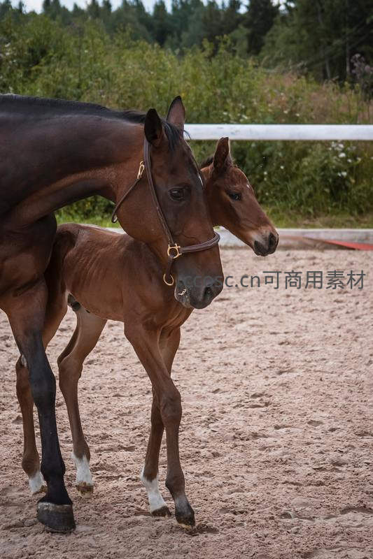 棕色母马与幼驹在沙地上亲密依偎,母马低头轻蹭小马,眼神温柔,展现出动物间深厚的情感纽带,背景绿植衬托出温馨氛围。