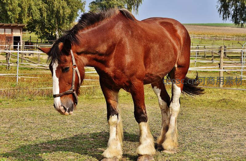 一匹体型魁梧、四肢带白色长毛的重型挽马在牧场中低头吃草,肌肉饱满,姿态沉稳,背景是木质围栏和远处的农田,尽显农耕文明的力量与宁静。