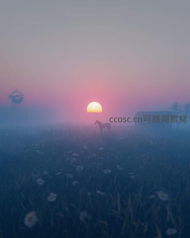 薄雾笼罩的田野上,一匹马静静伫立,背景是冉冉升起的朝阳和远处的风车小屋,整个画面如诗如画,充满宁静与梦幻感。