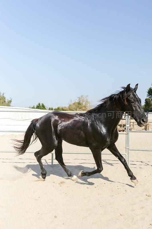 一匹健硕的黑色骏马在沙地训练场上奋力奔跑,肌肉线条分明,鬃毛飞扬,展现出力量与优雅并存的竞技状态和动感之美。