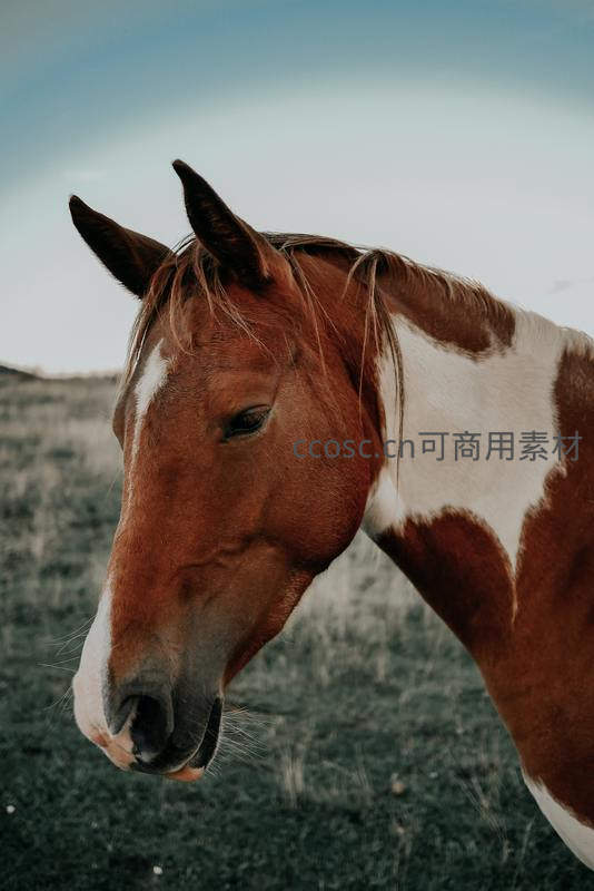 一匹棕白花色的马伫立在辽阔草原上,背景是淡蓝天空,其俊朗的侧脸与斑驳皮毛在自然光下格外引人注目。