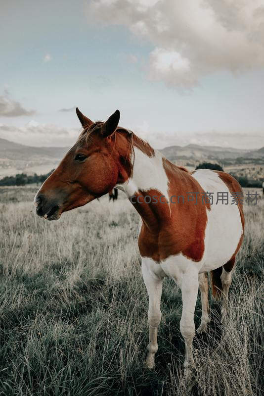 旷野中独立骏马,远山云影伴其身