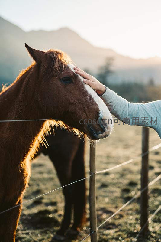 一只温柔的手轻轻抚摸着马儿的额头,在金色夕阳的映衬下,人与动物之间流露出真挚的情感与默契的信任。