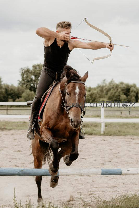 肌肉线条分明的骑手在奔腾的骏马上全神贯注拉弓瞄准,马蹄离地腾空,背景围栏模糊,凸显速度与力量交织的竞技瞬间。