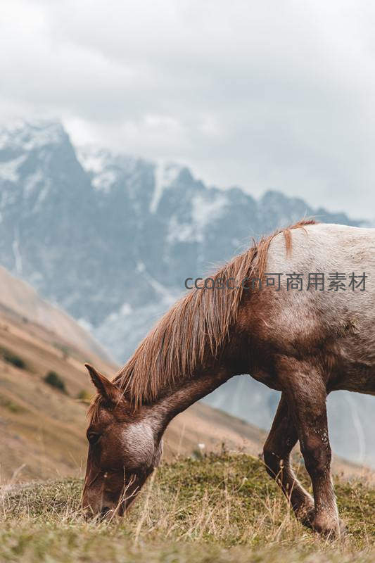 一匹带有斑点的马在高海拔草甸上低头吃草,身后是巍峨的雪山群峰,云雾缭绕,构成一幅壮丽而宁静的高原生态画卷。