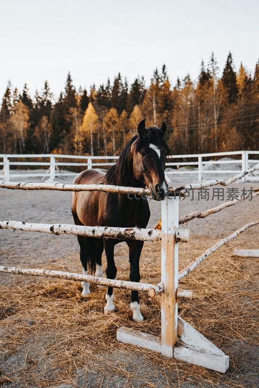 秋日围栏边的骏马静立凝望
