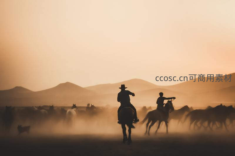 在金色落日余晖中,两位骑士的剪影正驱赶着马群奔腾,扬起漫天尘土,勾勒出一幅粗犷豪迈的西部牧归画卷。