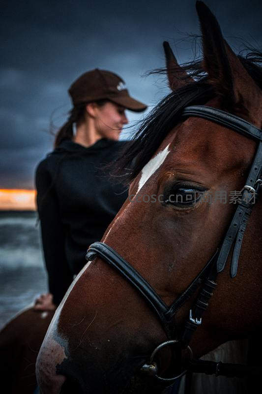 镜头聚焦于骏马深邃的眼眸,背景中主人温柔相伴,人与马在暮色海边共享静谧时刻,充满温情。