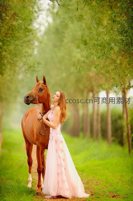 一位身着粉色长裙的少女在绿树成荫的小径上,温柔地依偎着一匹棕红色骏马,画面充满诗意与宁静,展现了人与自然和谐共处的美好瞬间。