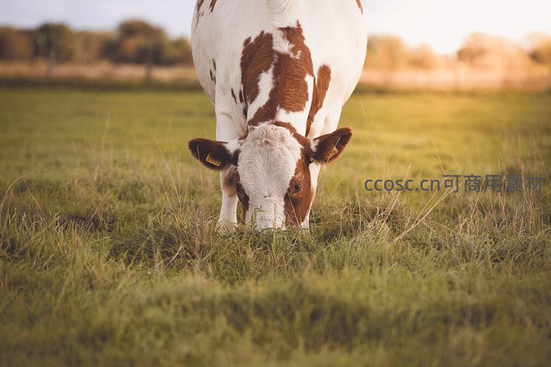 一头棕白相间的奶牛正低着头,在阳光洒满的翠绿草地上悠闲地吃草,背景是朦胧的田野和树木,画面充满田园牧歌般的宁静。