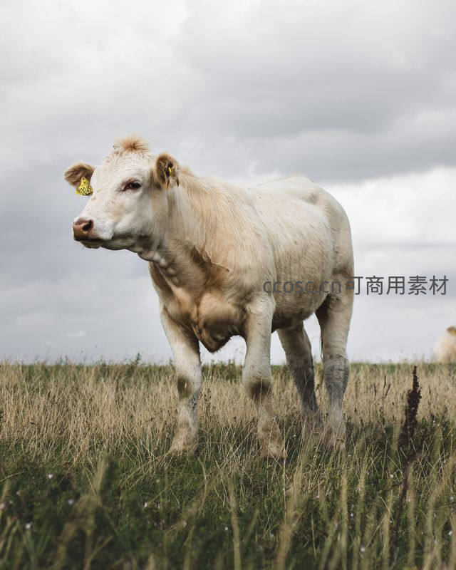 一头白色奶牛站在枯黄与青绿交织的草地上,耳朵佩戴黄色标签,侧脸凝视远方,灰白云层低垂,透出沉静的生命力。