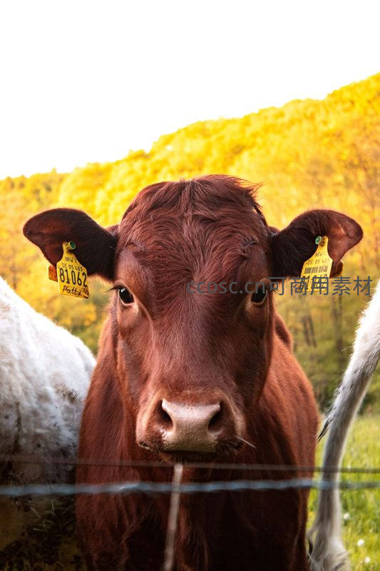 红牛耳标特写穿透铁丝网
