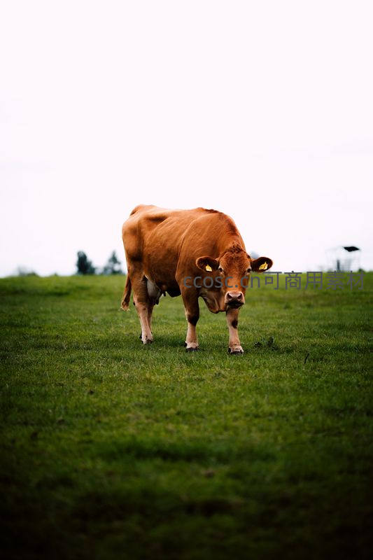 一头温顺的棕色母牛独自站在无垠的翠绿草地上,它低头缓步前行,背景是朦胧的天空和远处的树木,营造出一种平和、悠远的田园意境。