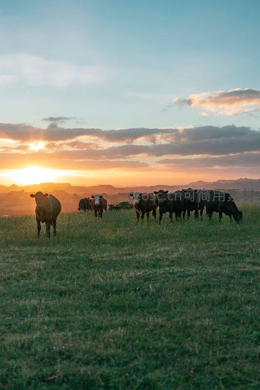 一群牛在广袤草原上缓缓移动,夕阳将天空染成橙红色,云层翻涌,牛群的剪影与壮丽天际线构成一幅诗意的牧歌画卷。