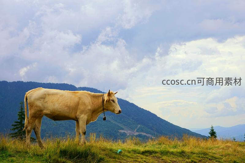 山巅黄牛静立,云海苍茫作背景