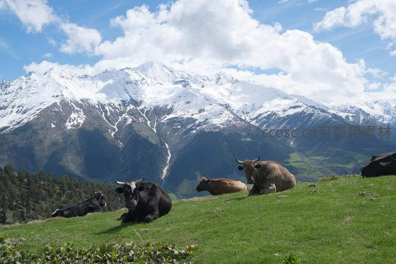 雪山脚下草甸上的悠闲牛群