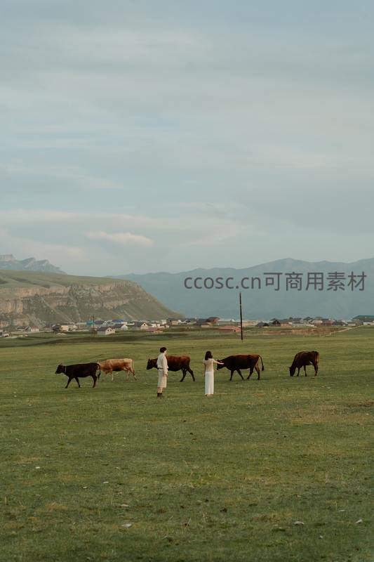 两位身着白衣的牧人在无垠绿野上陪伴着牛群缓步前行,背景是连绵山脉与散落村舍,蓝天白云下,人与自然和谐共处的画面洋溢着淳朴宁静的田园生活气息。