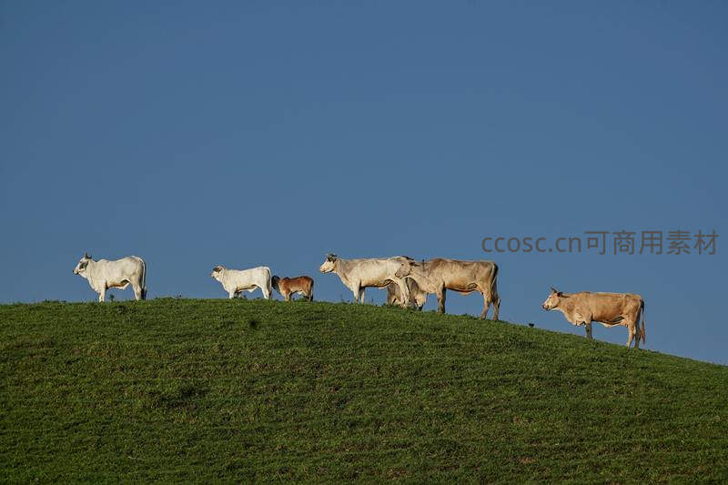 绿野牧歌:牛群悠然立于青翠山丘之上