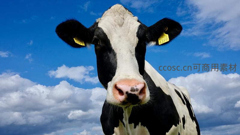 一头黑白花奶牛在蔚蓝天空和朵朵白云的背景下,正对着镜头凝视,耳朵上挂着黄色耳标,神情温顺而好奇。