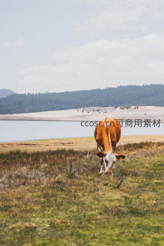 一头棕白相间的牛独自在湖边的草地上低头吃草,远处是平静的湖水和连绵的青山,天空云层轻薄,营造出静谧祥和的氛围。