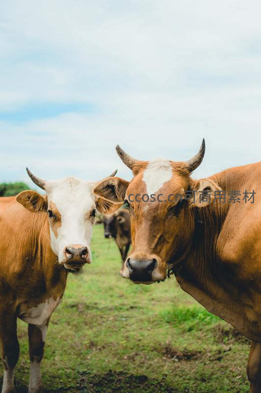 两头牛近距离面对镜头,一头白色带棕色斑纹,另一头棕色带白色额头,它们的眼神好奇而温和,背景是模糊的绿色草地与蓝天。