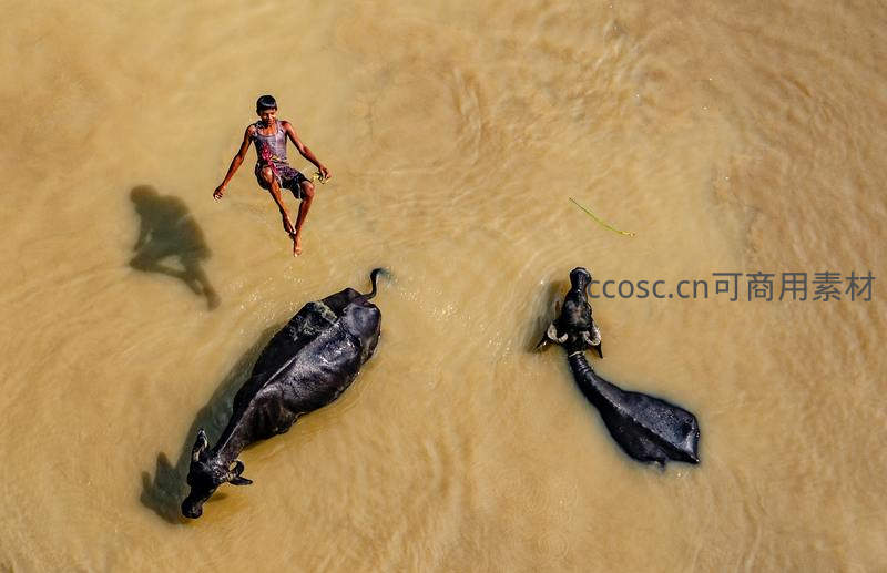 从高空俯瞰,一个男孩在浑浊的河水中奔跑,两头水牛相伴左右,构成一幅充满野趣与活力的乡村生活画卷。