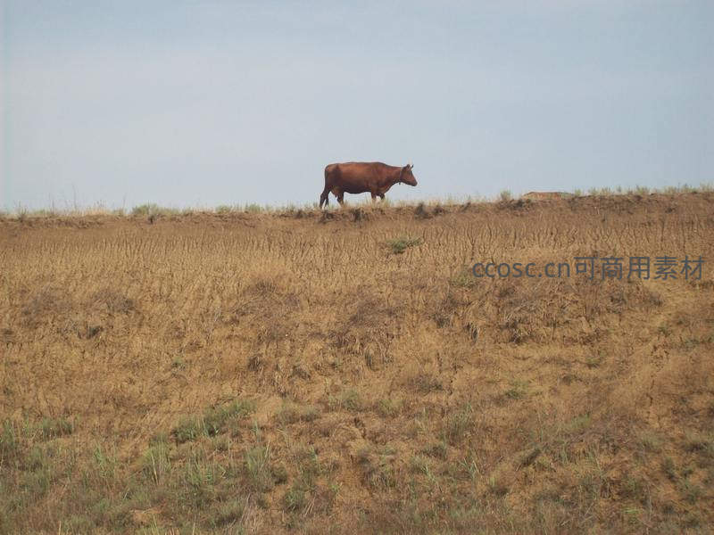 一头棕色的牛独自走在一片干枯的丘陵草地上,背景是空旷的天空,画面宁静而略带苍凉,展现了自然的原始之美。