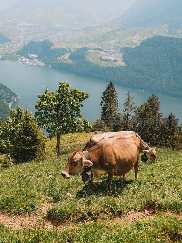 阿尔卑斯山麓奶牛悠然吃草俯瞰湖光山色