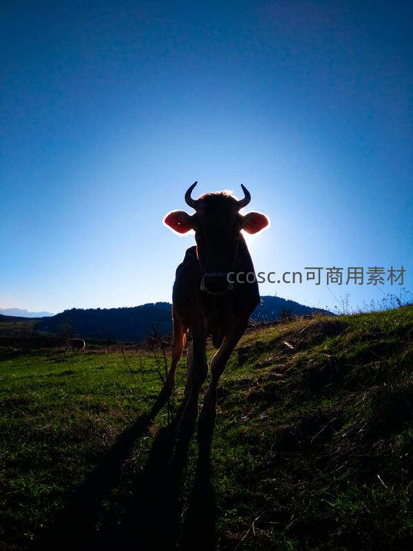 逆光剪影中的牛直视镜头背景蓝天如洗