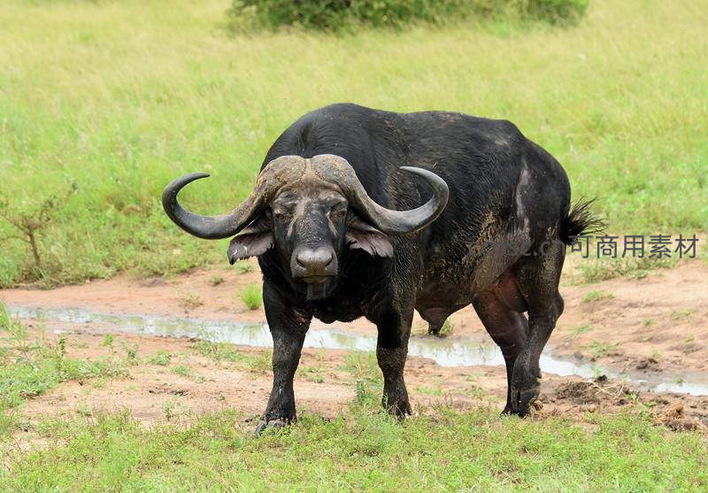 一只健壮的非洲水牛站在湿润的草原上,巨大的弯角和厚重身躯彰显其野性力量,背景是青翠草地与泥泞水洼。