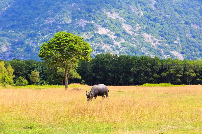 一头健壮的水牛在金黄与翠绿交织的草地上低头觅食,背景是连绵起伏、郁郁葱葱的山峦,展现出一派宁静祥和的田园牧歌景象。