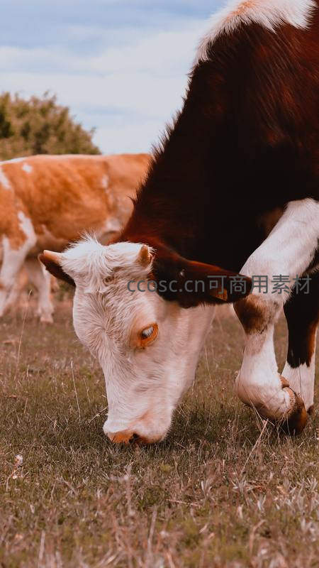 镜头聚焦于一头棕白相间的奶牛,它低垂着头专注地啃食青草,温顺的眼神流露出平静,背景虚化更突显了这份田园生活的恬淡与美好。