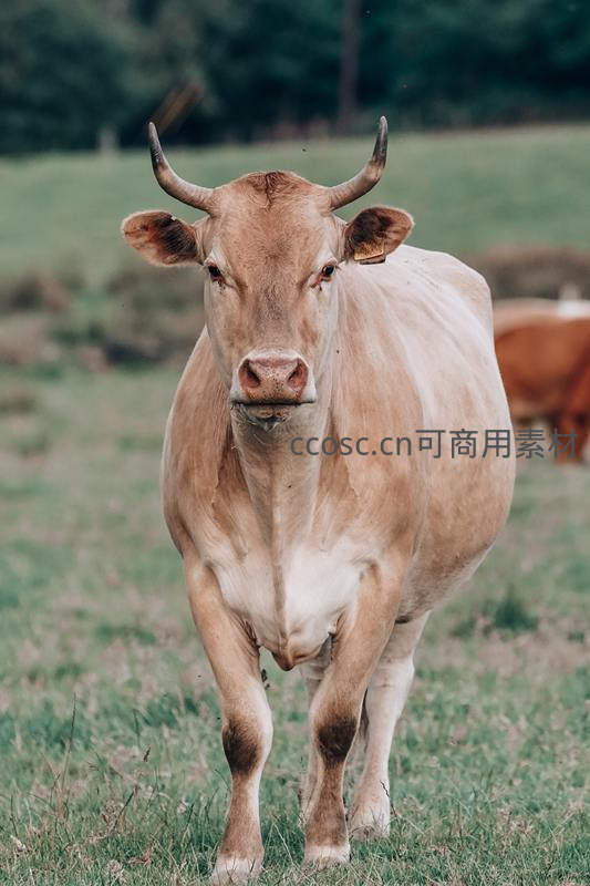 一头健壮的棕色公牛站在翠绿的牧场上,正对着镜头凝视,其锐利的眼神和粗壮的牛角展现出强大的生命力,背景是模糊的田野风光。