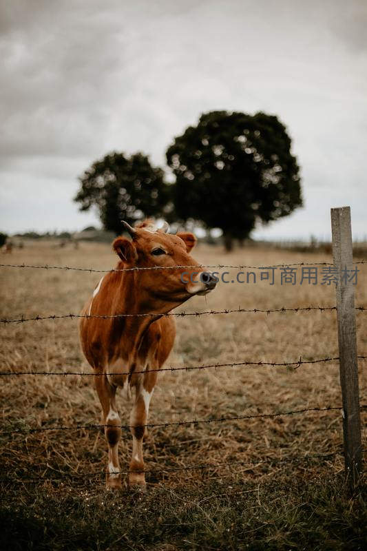 一只棕白相间的小牛站在干枯的草地上,透过带刺的铁丝网栅栏向外张望,背景是两棵孤树和阴沉的天空,营造出宁静又略带忧郁的氛围。