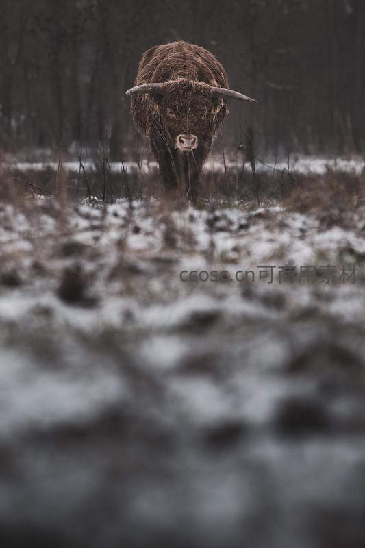 一头毛发浓密的高地牛站在薄雪覆盖的荒野中,背景是模糊的树林,它正凝视着镜头,展现出原始而宁静的野性之美。