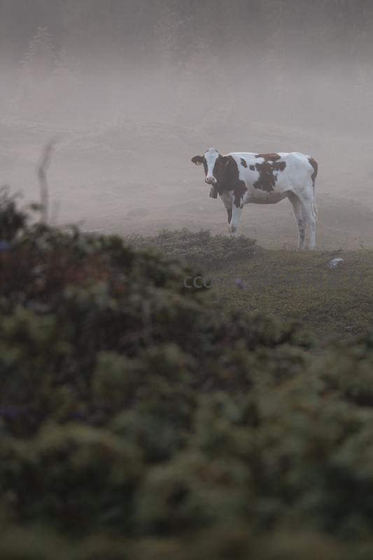 晨雾中的奶牛静立山岗