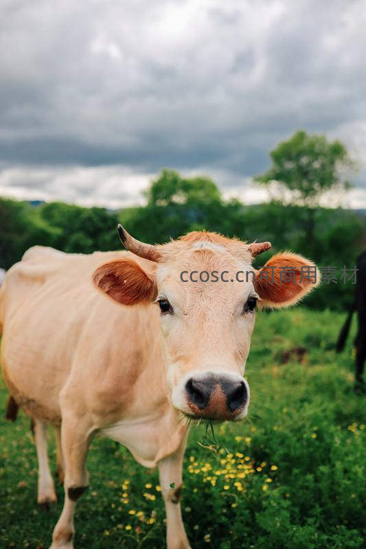一头浅色牛站立在绿草如茵的牧场中,正脸面向镜头,眼神温和,嘴角还沾着青草,背景是郁郁葱葱的树林与灰蓝色的云层,传递出宁静祥和的乡村气息。
